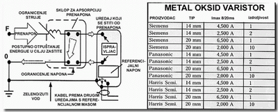 OPĆI POSTUPAK SPAJANJA ELEKTROAKUSTIČKIH UREĐAJA I ZAŠTITA OD PRENAPONA U suvremenim audio sustavima (high-end sustavi, studijski sustavi, sustavi ozvučenja) primijenjena audio elektronika ima izuzetno visok odnos korisnog signala prema šumu i vrlo niska izobličenja. Zbog toga je pri postupku postavljanja i ožičavanja sustava potrebno posvetiti izuzetno visoku pozornost kako elektroničkom povezivanju sustava, tako i promišljenom postavljanju elektroničkih sustava u prostoriji. Nadalje, primijenjeni audio sustav dijelom se sastoje od digitalne audio elektronike, koja ima posebne zahtjeve za električnim povezivanjem. Tipični problemi koji se mogu pojaviti pri nepravilnom postavljanju i ožičenju sustava su čujne smetnje (tzv. brujanje, šumovi, čujni produkti nestabilnosti-osciliranja i radiofrekvencijske smetnje). Pojava tih smetnji najčešće nije posljedica neispravnosti pojedinog elektroakustičkog uređaja nego je to redovito posljedica neispravnog uzemljenja sustava. U nekim slučajevima, za pravilan rad sustava postojeći sistem uzemljenja može biti u potpunosti neadekvatan. U takvim situacijama potrebno je izraditi posebno uzemljenje cjelokupnog audio sustava. U takvim okolnostima izvodi se tzv. tehnički čisto uzemljenje u dogovoru sa izvođačem instalacija i ovlaštenom osobom nadležne elektrodistribucijske mreže. Instaliranje tehnički čistog uzemljenja zahtijeva pomnjivo planiranje i izvođenje u svemu prilagođeno pravilima elektrotehničke struke. Centralno uzemljenje Za optimalni rad elektroakustičkog sustava potrebno je izvesti samo jedno zvjedište uzemljenja za sve audio instalacije. Svaki dio opreme treba imati posebni vodič do tog mjesta. Serijsko povezivanje masa audio uređaja do točke uzemljenja nije tehnički ispravno. Tamo gdje se primjenjuje digitalna audio elektronika mogu se uređaji uzemljiti putem "referencijalne mreže signala". Posebno mrežno napajanje Iz glavnog razvodnog ormara elektrodistribucije, potrebno je izdvojiti napajanje elektroakustičkog sustava te se ono ne smije koristiti ni u jednu drugu svrhu. Za sve druge potrebe električnog napajanja u zgradi; npr. termika, rasvjeta, elektromotorni pogon potrebno je izdvojiti posebno mrežno napajanje koje ne smije imati nikakvih dodirnih točaka s mrežnim napajanjem audio elektronike. Smještaj audio elektronike Ni u kojem slučaju ormari s audio elektronikom ne smiju se smještati u blizini razvodnih ormara ili izvora drugih elektromagnetskih zračenja. To se posebno odnosi na uređaje za snimanje zvuka koji su osjetljivi na elektromagnetska polja. Sustavi tonfrekvencijskog upravljanja ne smiju se primjenjivati usporedo sa mrežnim napajanjem elektroakustičkih uređaja. U teoretski idealnom slučaju za elektroakustički sustav potrebno je zvjezdasto uzemljenje na tehnički čisto uzemljenje čiji otpor u idealnom slučaju ne smije biti viši od 1 ohm. Noviji tehnički napredni digitalni audio uređaju zahtijevaju posebne uvjete što se tiče mrežnog napajanja. U prostorijama u kojima se nalazi veliki broj analognih i digitalnih uređaja, suvremena praksa preporučava tzv. uzemljenje u više točaka. Prenaponska zaštita Prenapon je kratki impulsni valni oblik napona, struje ili snage u električnom strujnom krugu, čije je trajanje manje od 1% frekvencijskog perioda mrežnog napajanja. Prenapon se pojavljuje u prvom redu uslijed grmljavine ili uključivanja i isključivanja induktivnih potrošača. Najbolji način zaštite Najbolja zaštita od prenapona za audio-video primjenu realizira se najvišom klasom varistora (MOV) koji se klasificiraju za visok broj pojava prenapona od 6000 V i strujama do 3000 A. Naročito je važno odabrati takav varistor koji neće naglo otpustiti energiju u zaštitni vodič. U slijedećoj tabeli prikazane su karakteristike nekih prikladnih varistora.