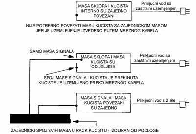 Uzemljenje kućišta elektroničkih uređaja Razni proizvođači na razne načine uzemljuju kućišta uređaja. Ako se uređaj na mrežu priključuje s 3-žilnim kabelom s utičnicom sa zaštitnim kontaktom (šuko), zemlja se priključuje direktno na kućište i na masu elektroničkog uređaja. U tom slučaju između uređaja i metalnog ormara s uređajima nije poseban poseban kratkospojni kabel na masu. Međutim u takvom slučaju proizvođač unutar uređaja može predvidjeti kratkospojnik mase signala sa uzemljenjem - tzv. GROUND LIFT. Uobičajeno je prekinuti tu vezu i putem posebnog kratkospojnika spojiti zajedničku masu ormara s masom signala. U trećem slučaju elektroakustički uređaj ima samo dvožilni spoj na mrežu te je obvezno povezati kućište uređaja s masom ormara.