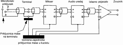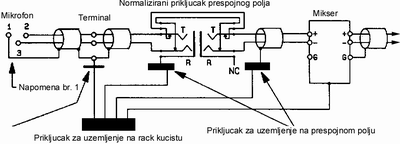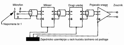 Napomene: 1. Oklop kabela priključen je samo na pin 1. Nije dozvoljeno spajanje pin 1. ili oklopa s montažnom kutijom 2. Oklop se spaja samo na jednom kraju - obično izvoru signala 3. Svako kućište uzemljuje se na zaštitni kontakt mrežnog priključka s 3 žice ili posebnim kratkospojnikom na zajednički spoj masa unutar ormara. Povezivanje mikrofona preko miksera