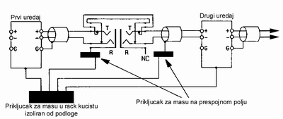 Napomena: 1. Oklop kabela priključen je samo na pin 1. Nije dozvoljeno spajanje pin 1. ili oklopa s montažnom kutijom 2. Oklop se spaja samo na jednom kraju - obično izvoru signala 3. Svako kućište uzemljuje se na zaštitni kontakt mrežnog priključka s 3 žice ili posebnim kratkospojnikom na zajednički spoj masa unutar ormara.
