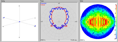 xvršno = (1.18 × 103 / f2 r2) 10 željena razina dB/20Poznajemo li vrijednost xvršno [mm] zvučnika, lako se izračuna razina zvučnog tlaka na frekvenciji f, ako je zvučnik polumjera r [mm].razina tlaka dB = 20 log (xvršno f2 r2 / 1.18 × 103 )Za vrijednosti f << k r = 1 vrijedi razina zvučnog tlaka dB = 10 log P A + 112.2 dB pa je supstitucijom[20 log (xvršno f2 r2 / 1.18 × 103 ) – 112.2] / 10 PA = 10 Za bas refleks kutiju minimalna frekvencija za rad s ograničenjem pomaka bit će niža od predviđene x max frekvencije te se može definirati približnom relacijomfmin » 2 1/2 fXmaxProvedenom analizom, rezultirajuća teoretska razina zvučnog tlaka u ječnom polju bit će: dB SPL = ( 67.2 / 64) + 115 = 116.05 dB Svaki od četiri primijenjena subwoofer zvučnika ima vlastito pojačalo PHONIC MAR 6 izlazne snage od 2000W. Očito je da će primjenjena zvučnička skupina zadovoljiti najzahtijevnije potrebe reprodukcije niskih frekvencija. Za područje iznad frekvencije odrezivanja subwoofera primijenit će se zvučne kombinacije sa 2 basa i hornom 90x40 za biamplifikaciju ukupne snage 1200W tip FR215-4A PI-AUDIO. Zvučnici su postavljeni sa svake strane portala, a treći zvučnik će se postaviti na istoj visini iza projekcijskog ekrana na posebno konstruiranom nosaču, za Dolby Surround reprodukciju. Svaki zvučnik napaja po jedno dvokanalno pojačalo MAR 6, snage 2x600W. Gornje slike prikazuju horizontalnu i vertikalnu karakteristiku usmjerenosti sa 2 zvučnika i sa 3 zvučnika s hornom usmjerenosti 90x40 stupnjeva, na frekvenciji 2500 Hz i udaljenosti od 30 m u sredini auditorija. Primijenjeni digitalni procesor SONY SRP F-300 omogućava korisniku konfiguriranje putem PC računala u dvokanalni 11-pojasni parametrički ekvalizer i kompresor ili 31- pojasni grafički ekvalizer s digitalnim kašnjenjem do 880ms na ulaznim kanalima. Interno se signal može preusmjeriti na 6 izlaza. Pored toga moguće je konfigurirati parametrički ekvalizer, 3 promjenjiva band-pass filtera tj. aktivnu skretnicu, izlazno kašnjenje signala, Peak limiter, Phase reversal, Mute, TEST generator ružičastog šuma i promjenjivih sinusnih frekvencija. BLOK SHEMA RAZGLASNOG SUSTAVA Blok shema prikazuje jednu od mogućih varijanti jer je sustav izuzetno fleksibilan kako zbog primjene prespojnih polja na ulazu tako i zbog digitalnog procesora sa 50 mogućih konfiguracija koje su unaprijed programirane. Obratite pozornost da zbog preglednosti, na shemi nije prikazan surround procesor za sustav sa 20 zvučnika od 200W i pripadajučim pojačalima i procesorom te da je shema principjelna i pojednostavljena, a ne stvarno izvedena na objektu. Klikni na sheme za detaljniji prikaz (gif 965x633). Principjelna shema spajanja s mogućnošću rekonfiguracije - klikni za detalje