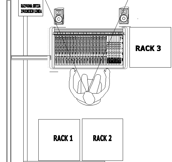 strane, desno od miksera nalazi se rack s izvorima i snimačima zvuka tj. uređajima koji se podešavaju za vrijeme rada. Na pozornici je montirano 8 mikrofonskih priključnih