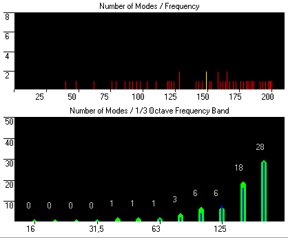 Slika prikazuje sve modove koji nastaju u promatranoj prostoriji i točne frekvencije. Donja slika prikazuje raspored modova po treć insko oktavnim intervalima. Pri tome, plava linija prikazuje teoretsku idealnu distribuciju modova, a zelena prikazuje stvarnu distribuciju.Distribucija modova relativno je pravilna ali, uočljivo je odmah kako je u trećinsko oktavnom intervalu u okolišu 100 Hz broj modova nešto veći od teoretski idealne distribucije. To je područje u kojem možemo očekivati koloraciju. Višestruki modovi koji nastaju na tim frekvencijama rezultirat će naglašenom rezonancijom prostorije. Točne frekvencije možemo vidjeti iz tabelarnog prikaza modova. Najveći utjecaj na kvalitetu reprodukcije imaju aksijalni modovi pa ćemo prvo njih proanalizirati.
