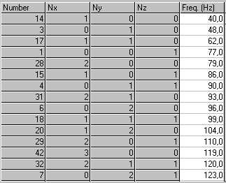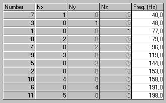 Aksijalni modovi po frekvencijama pokazuju frekvencijsku razliku od 23 Hz između modova od 96 Hz i 119 HzBolji uvid u koloracije zvuka možemo ostvariti uvidom u sva tri tipa modova koji su po porastu frekvencije predstavljeni u slijedećoj tabeli. Obratite pozornost: ovo nisu svi modovi do frekvencije 200 Hz, nego samo do 123 Hz!