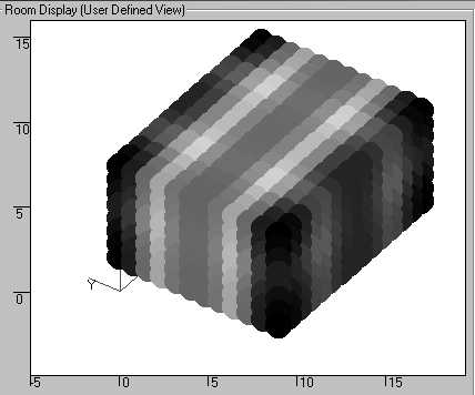 Koloracije nisu izražene u području u kojemu je udaljenost susjednih modova manja od 20 Hz, a takvih područja ovdje nema. Međutim, na frekvenciji 90, 93 i 96 Hz su rezonancije koje će ovo frekvencijsko područje naglasiti pri reprodukciji.Prikazat ćemo 3-dimenzionalnu raspodjelu zvučnog tlaka kombiniranog odziva gore navedena 3 moda u prostoriji.
