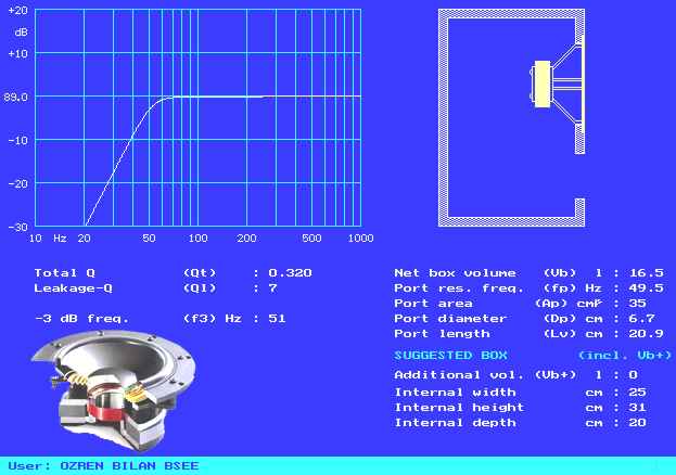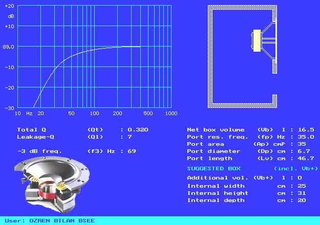 Podatke koje ste mi poslali analizirao sam u dva različita programa. Razultati prvog programa prikazani su na slijedećim slikama. Rezultati analize su potpuno identični, uz malo odstupanje u frekvencijskom obliku krivulje, ali samo ispod frekvencije f3. Uzrok tomu je što loud30 koristi u definiciji zvučničkog modela mnogo manje parametara. Želim još napomenuti da ova analiza nije uzela u obzir termičku kompresiju zvučnika (vidi Akustika prostorija, str. 184.) Kutija u koju je vaš zvučnik ugrađen ima slijedeće karakteristike: