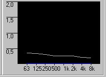 Koordinate zvučnika su 1.09 m i 1.40 m od zidova, a lokacija slušatelja je na simetrali prostorije 1.18 m od zida. Važno je napomenuti kako ovo nisu jedine idealne točke za postavljanje zvučnika, jer one ovise o parametrima procesa optimizacije. Međutim, ovdje moramo naglasiti kako primijenjeni program nema mogućnost uzimanja u obzir izvora najnižih frekvencija iz dna lijevka zvučnika, što može djelovati na proces optimizacije. Položaj slušatelja je određen s obzirom na maksimalno ujednačen odziv niskih frekvencija. Pomak prema stražnjem zidu progresivno će pojačavati glasnoću niskih frekvencija. Ako niste zadovoljni ovim akustičkim rješenjem, čija bi karakteristika trebala biti u znatnom smirenju niskofrekvencijskog opsega, uvijek se možete pomaknuti prema stražnjem zidu. Gornja slika (3D raspodjela zvučnog tlaka u prostoriji) će vam biti vodič, koliko ćete naglasiti područje u okolišu cca. 100 Hz. Ako ne slušate glazbu sami, plavi šesterokut je područje u kojem bi trebala biti sasvim zadovoljavajuća kvaliteta glazbe svim slušateljima.Pravokutnici na zi dovima i trokuti u kutovima prostorije, te pravokutnik iznad slušatelja su idealne lokacije za postavljanje apsorbera, na frekvenciji modova koji uzrokuju koloraciju. Ovdje je potrebno uočiti kako su kutni apsorberi postavljeni cijelom svojom visinom u prostoriji, dok su bočni apsorberi postavljeni na gornjoj polovini zidova.Još nam je ostalo optimizirati vrijeme odjeka . Općenito uzevši, u ovako malim prostorijama vrijeme odjeka se često ne primjećuje jer je ispod reda veličine 1.0 sekundi. Štoviše ni ispitivanja akustičara nisu potvrdila postojanje tzv. idealnog vremena odjeka. Međutim, ipak je vrijeme odjeka važno ishodište pri analizi neke prostorije. Za vašu slušaonicu, ovo bi bila vrlo dobra krivulja odjeka: