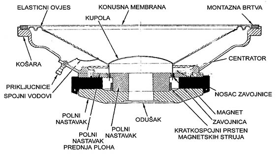 Presjek tipičnog kvalitetnog zvučnika sa svim sastavnim dijelovima Kao mehanički sustav zvučnika najčešće služi - konusna membrana s jednim stupnjem slobode. To označava da je kretanje membrane moguće samo u jednom smjeru prostora. Jedan stupanj slobode omogućava izvedba mehaničkog spoja membrane s kućištem ili, kako se još naziva, košarom zvučnika. Kućište zvučnika izrađeno je redovito od metala. Nekvalitetna kućišta izrađena su od štancanog“ lima i nemaju dovoljnu krutost i inertnost pri reprodukciji jakih bas tranzijenata. Kvalitetnija su kućišta lijevana od aluminija ili magnezija pod tlakom. Ona imaju veliku krutost ali i gušenja rezonantnih pojava. U principu, kućište treba biti vrlo kruto i ne smije odzvanjati. Na širem dijelu membrana je spojena s kućištem ovjesom-elastičnim rubom, a na užem dijelu centratorom. Na uži dio konusne membrane spaja se nosač zavojnice, sa zavojnicom. S vanjske strane zavojnica je zaštićena kupolom kako bi se spriječio ulaz prašine i raznih čestica u procjep, a to poboljšava i odziv zvučnika na višim frekvencijama. Zavojnica zvučnika izrađena je od lakirane bakrene ili aluminijske žice. Početak i kraj žice zavojnice spojen je s konektorima na košarizvučnika. Zavojnica je uronjena u magnetsko polje prstenastog procjepa. Procjep tvore polni nastavci od mekog željeza pričvršćeni na magnet. Magnet i polni nastavci tvore - magnetski krug zvučnika. Centrator, koji ima elastično djelovanje, mora zavojnicu držati točno u centru procjepa i onemogućavati njen ekscentrični položaj ili savijanje. Svaki pomak iz centra može dovesti do trenja namotaja žice pod naponom s metalnim polnim nastavcima i do pregaranja zvučnika i pojačala. Procjep se mora napraviti što uži kako bi magnetsko polje u njemu bilo što jače, a to istovremeno omogućava bolji prijelaz topline sa zavojnice na polne nastavke. Kod nekih zvučnika kroz centar polnog nastavka napravljen je odušak. Time se pojačava cirkuliranje zraka koje hladi zavojnicu, ali i mijenjaju neke značajke zvučnika. Nastajanje zvuka Dovedemo li iz izlaznog pojačala snage struju u ritmu audio frekvencija, oko zavojnice će se formirati promjenjivo elektromagnetsko polje koje će reagirati s poljem stalnog magneta. Između polja stalnog magneta i promjenjivog polja u prostoru oko zavojnice, koju uzrokuje struja i, javit će se privlačna ili odbojna sila F. Ta sila proporcionalna je indukciji magneta B, dužini zavojnice l te smjeru i jakosti struje i. Sila će potaknuti membranu na titranje, a ona će potaknuti na titranje čestice okolnog zraka. Mehanički titraji membrane trenjem će tvoriti u zraku zvučne valove. Sila (F = Bil), koja djeluje na membranu zvučnika, treba nadvladati tri različita tipa sila koje joj se suprotstavljaju. To su inercijske sile, sile trenja i elastične sile. Inercijske sile, proporcionalne akceleraciji, određuje ukupna masa membrane i zraka koja titra zajedno s membranom. Sile trenja, proporcionalne brzini, određuje unutrašnje trenje mehaničkog sustava membrane i trenja čestica zraka. Elastične sile, proporcionalne pomaku, ovise o krutosti cijelog sustava. Od svih sila samo sila trenja čestica zraka ostvaruje zvučne valove. Interesira nas kako dobiti zadovoljavajuću reprodukciju niskih frekvencija? Kako dobiti dobar bas - bas koji će imati dubinu i brzinu, tj. udarac. To će definirati zvučnička kutija; ali prije nego se pozabavimo bas refleks, potpuno zatvorenom ili zvučničkom kutijom s lijevkom potrebno je prvo upoznati prednosti i mane samog dinamičkog pretvarača - bas zvučnika. Konstruktori su pokušali riješiti mnoge nedostatke dinamičkih zvučnika različitim pristupima. Promotrit ćemo nekoliko različitih pristupa konstrukciji bas zvučnika. Ako zapamtimo sve načine pristupa, samim pogledom na bas zvučnik, moći ćemo zaključiti o mnogim njegovim osobinama bez slušanja i bez uvida u karakteristike. Podjela i konstrukcijske razlike Uobičajena je podjela dinamičkih zvučnika po osjetljivosti, efikasnosti i linearnosti. Osjetljivost i efikasnost Osjetljivost nije isto što i efikasnost. Referentna efikasnost ili korisnost je funkcija elektromehaničkih značajki zvučnika i predstavlja akustički izlaz na niskim frekvencijama pri kojima je širenje zvuka jednoliko na svim frekvencijama. Izražava se omjerom akustičke i električne snage. Npr. ako dobijemo 2 W akustičke snage, a uložili smo 100 W električne snage, korisnost je 0.02. Pomnožimo li vrijednost sa 100, dobije se korisnost u postocima tj. 2%. Izračunamo li 10 log od 0.02, dobijemo da je korisnost -17 dB. Osjetljivost pokazuje izmjereni zvučni tlak na osi zvučnika pri zadanoj ulaznoj snazi i udaljenosti (najčešće 1 W/1m). Izmjerena osjetljivost može se, ali ne mora podudarati s efikasnosti. Zvučnici niske i srednje osjetljivosti Primarna upotreba im je za bas zvučnike potpuno zatvorene ili bas-refleks izvedbe u monitor i subwoofer zvučnim kutijama te zvučnicima za visoku vjernost. Za tu primjenu neophodna značajka je veliki pomak membrane na niskim frekvencijama, vrlo mala izobličenja te linearan odziv i na gornjem dijelu spektra kako bi se pravilno ukrštavali sa srednjetonskim ili visokotonskim zvučnicima. Osjetljivost im je od 80 do 89 dB (niska osjetljivost), a do 95 dB (srednje osjetljivosti). Referentna efikasnost od 0.5 do 2 %. Zavojnica se izrađuje od bakrene žice i obvezno je duža od magnetskog procjepa kako bi se realizirala maksimalna linearnost. Nosač zavojnice izrađuje se od aluminija, kaptona, nomexa ili kompozitnih materijala kako bi imala krutost i dobru vodljivost topline. Noviji zvučnici najviše koriste Kapton. Centrator zvučnika treba konstrukcijom onemogućiti pomake membrane bez narinutog signala i nestabilnosti pri maksimalnom signalu, te omogućiti niska izobličenja i brzi tranzijentni odziv. Membrane su konusne, ravne, ili s rebrima i pojačanjima, relativno visoke mase za vis